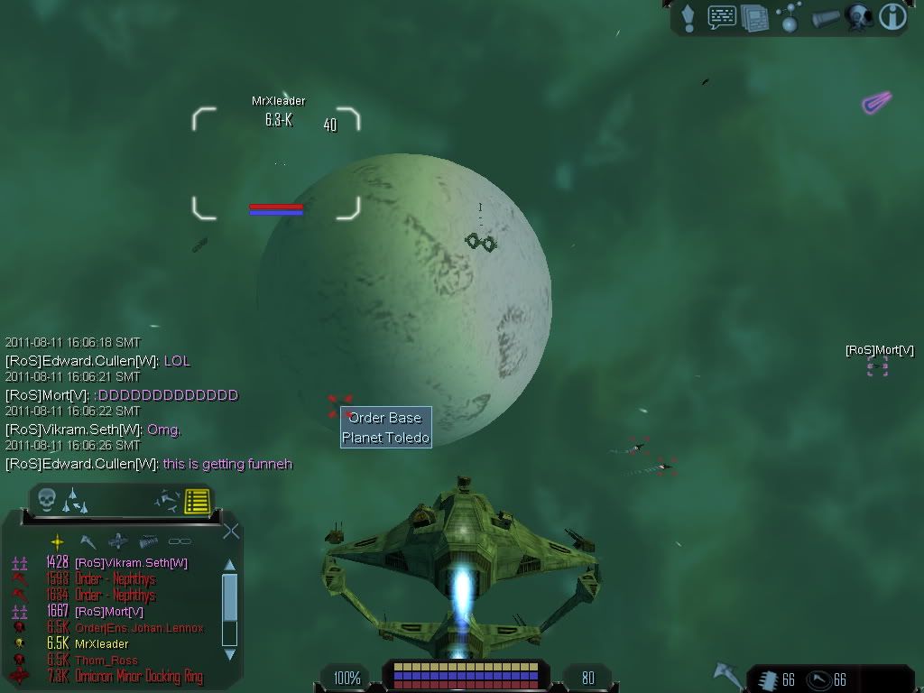 When we arrived near Toledo, first wave of Order forces with consisted of 1 Primary Fleet Ensign and few independent pilots, was already waitin' for us. After some nice chattin', they engaged. We managed to destroy them without a scratch. After that, second wave arrived. This wave was little bigger, and fight took us to Omicron 100. Order tends to keep it in secret, but It's obvious that some of Primary Fleet agents use it as place to hide from enemies, so we were there too. After some time, back in Minor, we successfully managed to take out few more fighters and gunboat. So, we took out 6 fighters and 1 gunboat in total, without any losses.