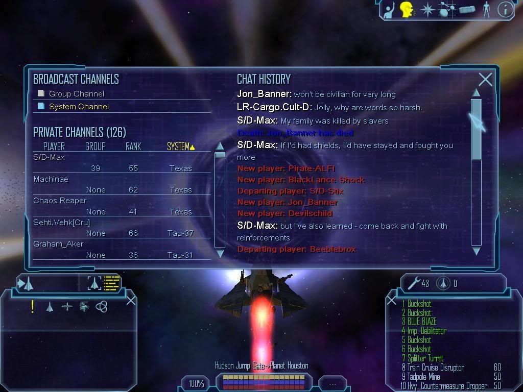 Was doin pantrols through liberty last night, spotted a bounty from the boars a vm904, i headed him off at the texas gate, i think he realized i was waiting on him cuz he turned around and went back the other way, i went throgh tha gate and begain persuing but as luck would have it one of them groups of damned roughes blasted ma engine with a disruptor while we were goin through a debri field.