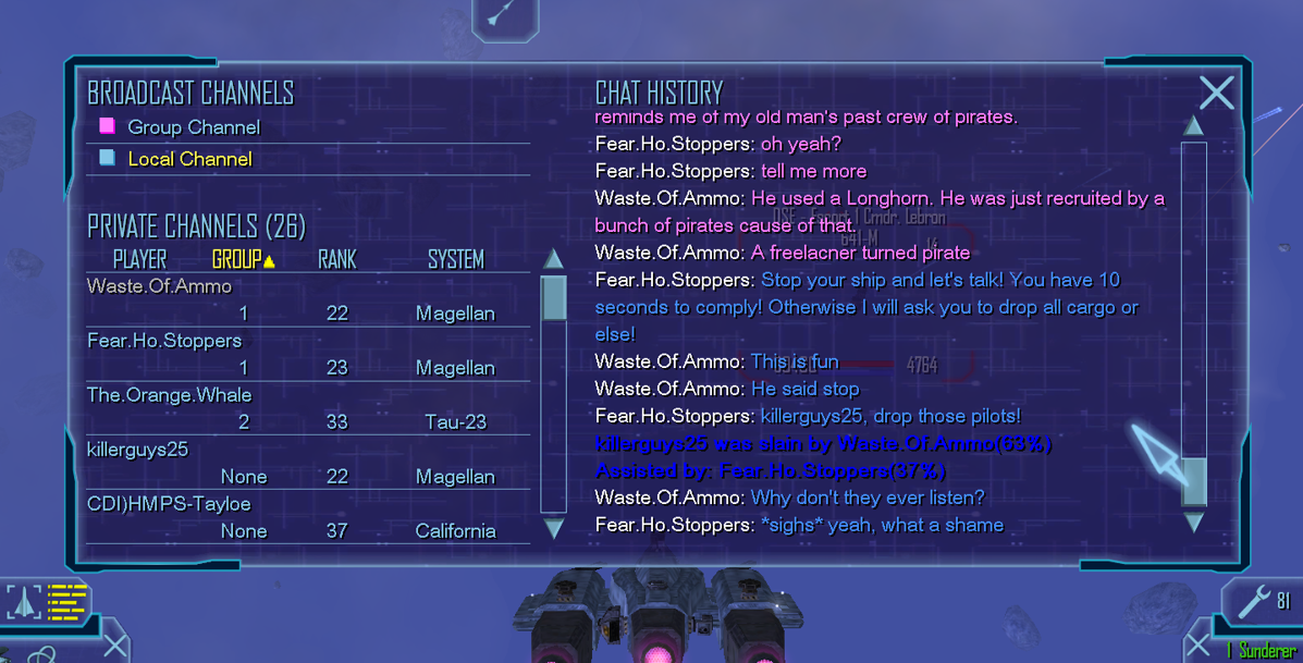 - Now this one is great: in system chat, ooRP insults and threatens pirates / lawfuls when he gets caught or destroyed