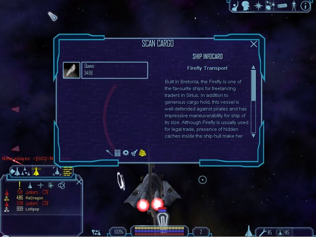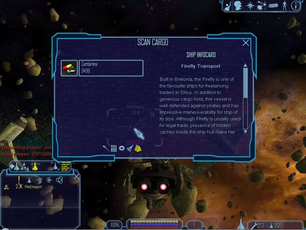 Upon entering California, I saw them on my scans briefly, at 13K distance. I thought they'd taken a trade lane, and immediately headed for Cali Minor, Mojave, and the JG. Rush and I set up an interdiction of the JG to NY, remaining in contact with the LSF the whole time. Finally the LSF made it to California, and we could STILL see these craft on system scans, but no where close to us. We quickly checked the trade lanes again to Los Angeles and Cali Minor - the LSF officer was ready to give up.