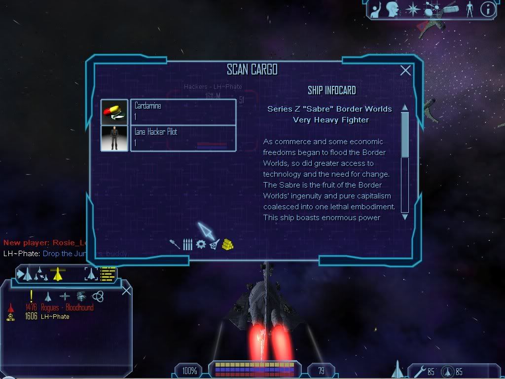 I was responding to a call from Feral for assistance in New York then when a drugged out Lane Hacker jumped me almost to the Texas/NY JG. This guy liked his cardi - which for personal use is fine, but it sure clouds your judgement. He demanded that I drop my cargo of captured pirate pilots. I got on the comm channel to Feral and Bobafett, and both responded. Unfortunately, Phate managed to destroy my ship just after Feral joined me. I suspect that he used a computer virus to infect my controls, as I was barely able to eject safely. That, and I had a hard time controlling the Memory. I KNOW he had to have some kind of nefarious virus, because he also managed to destroy Feral's ship, with a virus that mimics ion storms. Fortunately, a passing freighter tractored us both in, and put me back on Texas.