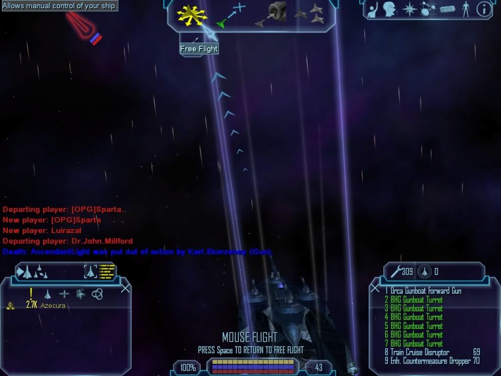 So, I headed to the Jumpgate, and I encountered an Outcast falcata. After informing him that I would be vaporizing his ship, I began to open fire. I hesitated for a minute, when I swore I thought the guy was not firing back, but instead, just flying around and attempting to dodge.