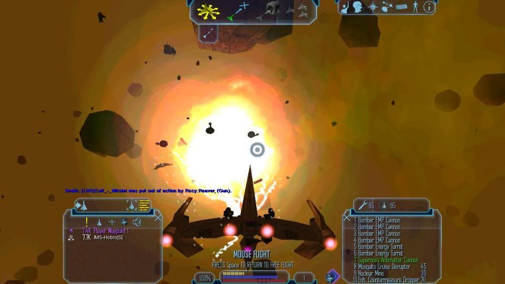 Pertinent kill background informationYesterday Some Navy Bombers were fighting Two Rhineland Battleships and I managed to isolate one of the Bombers pilots named Dean Winchester and when he was almost dead he hit his own mine and Died.