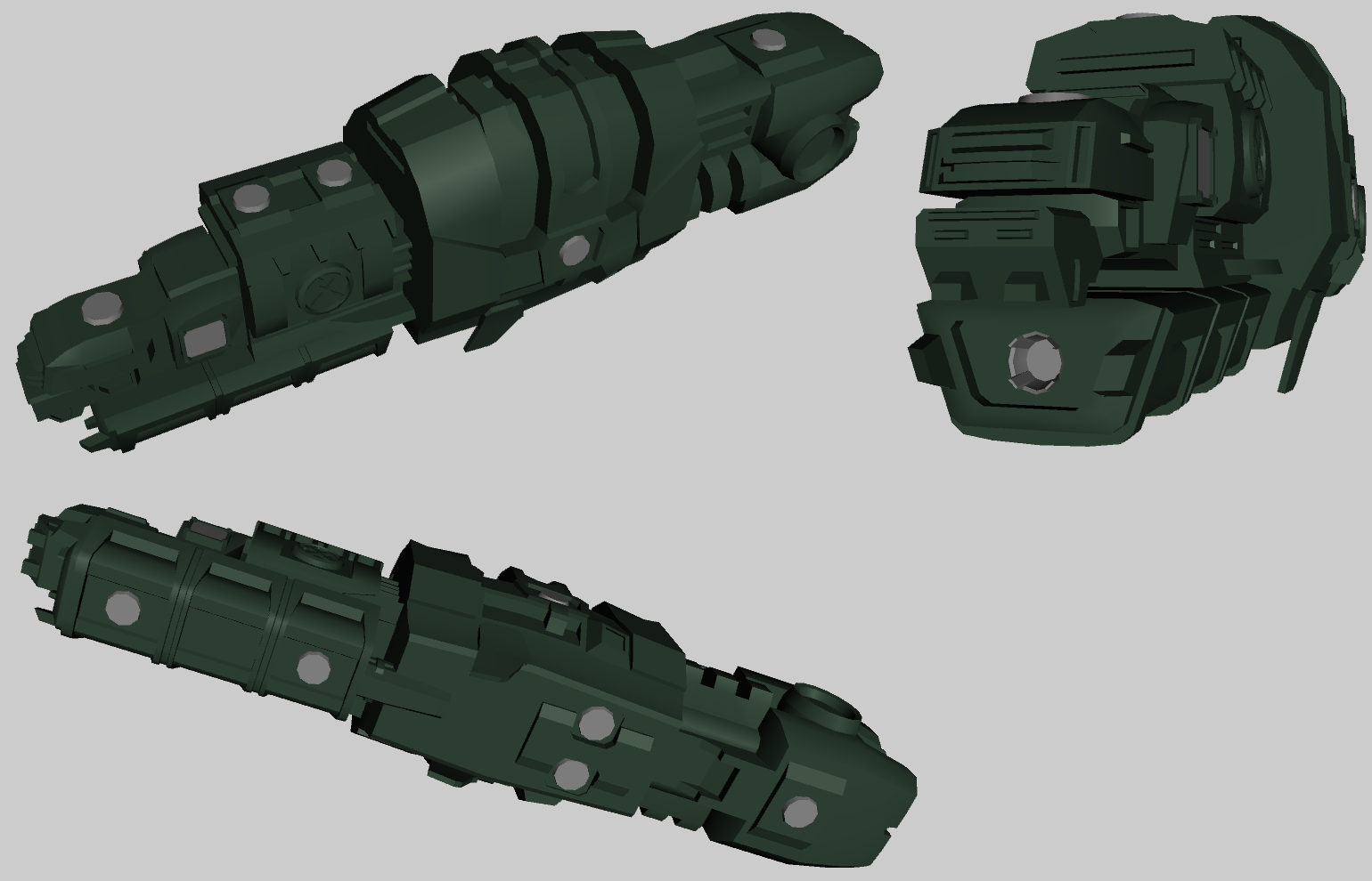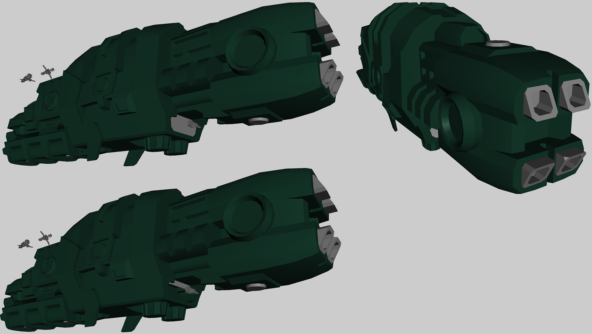 Note, the main hull being green is so it is easier to tell the engine nozzles and the hangar-bay door out from the rest of the model, since what I was using for rendering messes up the smoothing. The Valkyrie fighters are to scale.