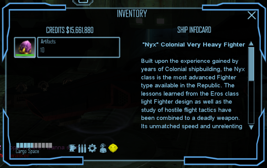 "Bonjour! Nothing but a simple patrol for today. We took a visit to the Nomad Gate in Coronado. Nothing there today, but there was the wreck of what seemed to be a fortune hunter there. I found some Artifacts on his hold and took them to Sabah, for the Order Scientists stationed there to study."