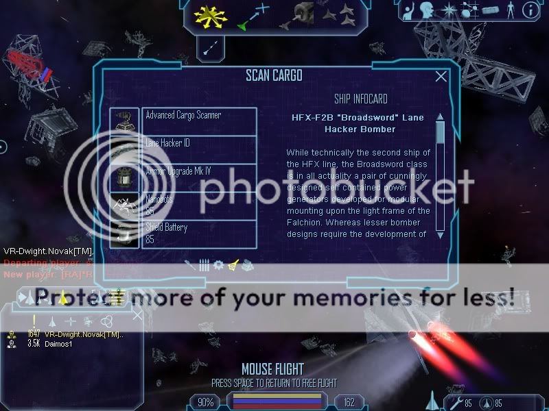 After a short while, a strange gentleman decided to join the battle against me. I was forced to put his vessel out of commission before resuming my efforts against the Raider. It took time, but I managed to draw the Broadsword into position for a final shot by my supernova cannon.
