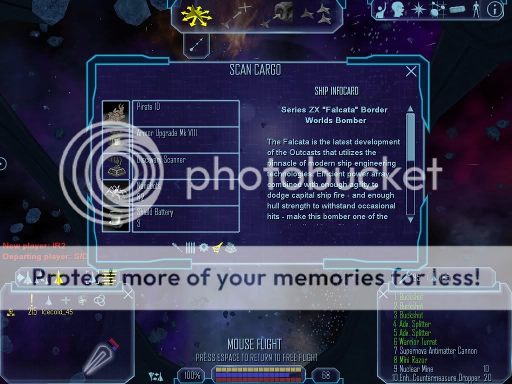 After reaching Bretonia we parted ways and I flew to Liberty space. After some training in Connecticut I did some patrolling with my bomber. In California I ran into Icecold-45 who was engaging in piracy. He ran as soon as he saw me, keeping out of scanner range. I pursued the suspect into the Sierra Field where he disengaged cruise engines and turned around to engage me. I caught a couple of quick pictures for my analysis today as the fighting had begun. I noticed he's an unaffiliated pirate flying a Outcast Falcata Bomber sporting a Hacker tag. After a lengthy battle he proved to be no match for me and subsequently taken apart, here are the gun camera shots: