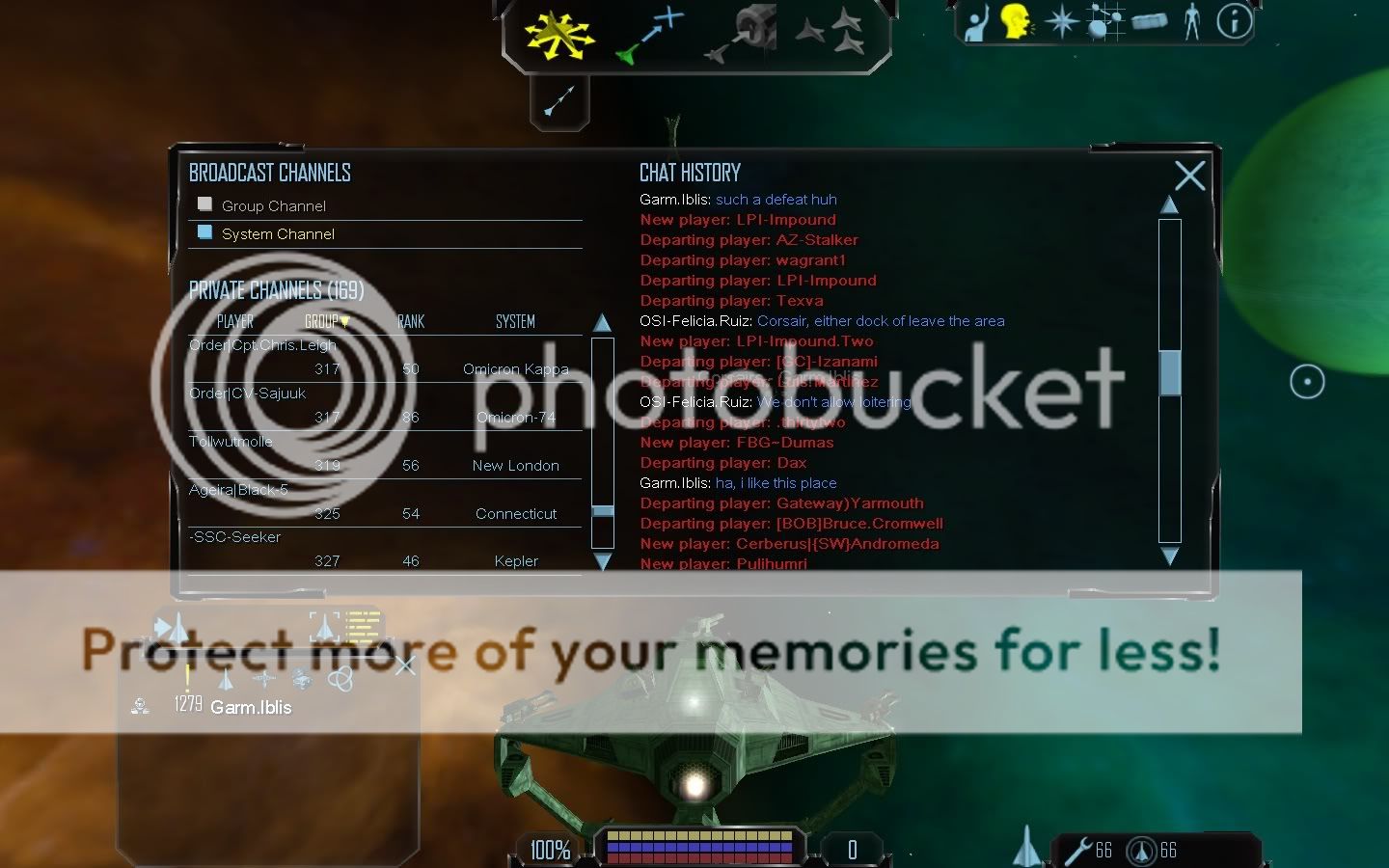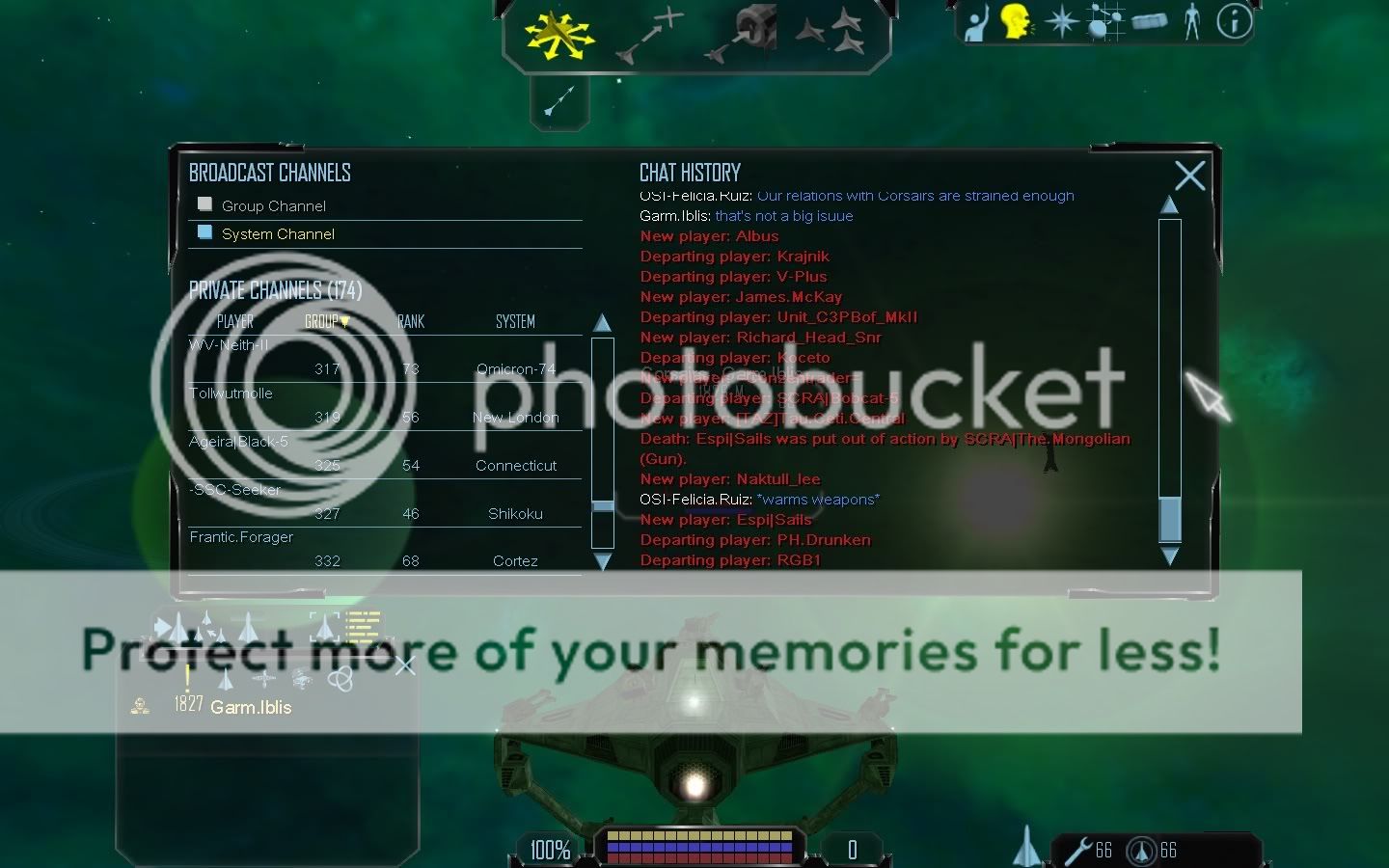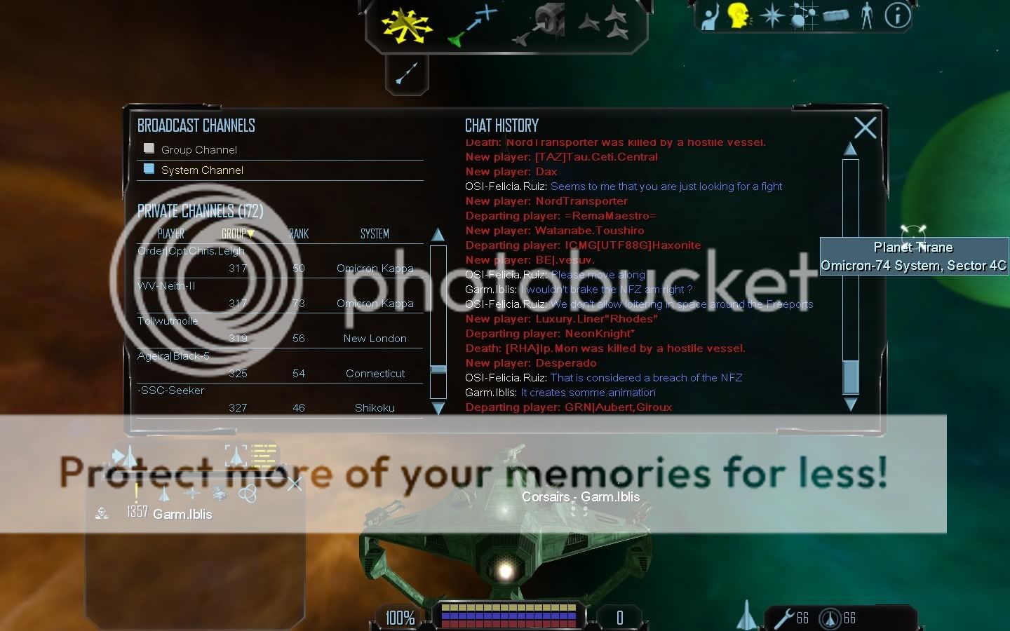 I ran into a Corsair loitering by Freeport 15 today. His comm ID was Garm.Iblis. He was thrusting around the station and on one occasion rammed my ship. After a few moments I asked him to move along. I gave him several chances, but he would not comply. I was forced to engage his ship and unfortunately my ship was disabled.