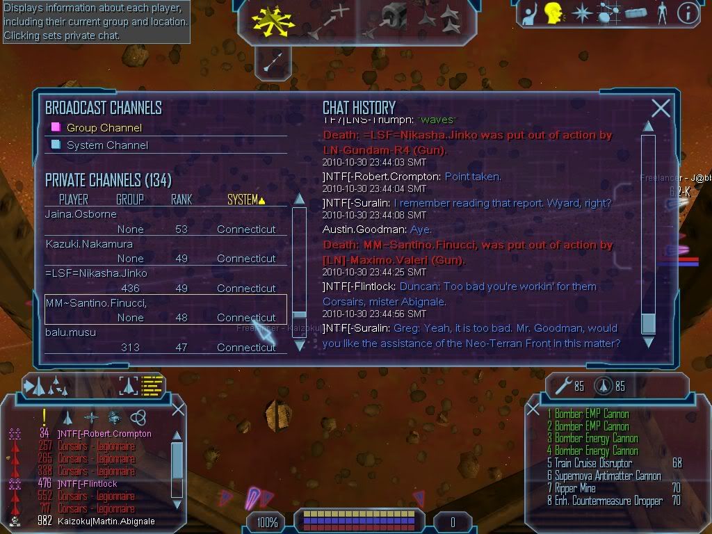 Upon destruction of all Corsair forces in the area, we temporarily combined forces with the Mandalorians and the Joker to make a decisive strike in to Gamma. Oddly, Gamma was empty, except for a lone Farmer's Alliance man who could neither confirm nor deny the presence of Corsair platters in-system. With no hostiles in-sight, we returned to Freeport 1 to continue diplomacy with the local Hessians.