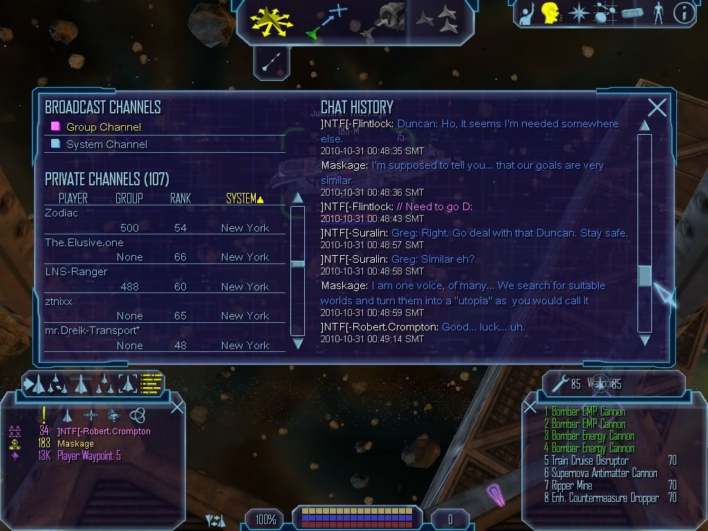 Well I went on a one man run down to New London, Ran across a BAF) can't remember his name we exchanges a few words. after this I docked at Trafalgar Base get repaired continued to Leeds noting, Jumped threw Dublin Jump hole and what do you know as soon as I jump throw I came across a Scylla and a fighter under the IFF Tags. I asked what was going on and they invited me to join there "patrol" witch at first I thought they where hunting miners..."pause for a moment"...Sorry where was I. Any way did a Deep patrol around the IMG Battleship Hood. Went back there to introduce myself sat and chat for about 10 mins. Then ever one got off but this Vary Friendly Merc with a IMG ID came on. We really...hit..it...of. Oh Her name is Anna. Sorry thats all I half to report. Heres some of my Report.