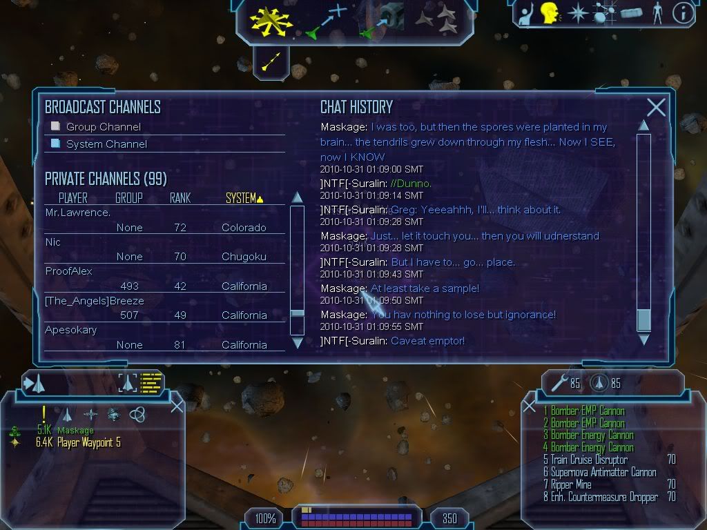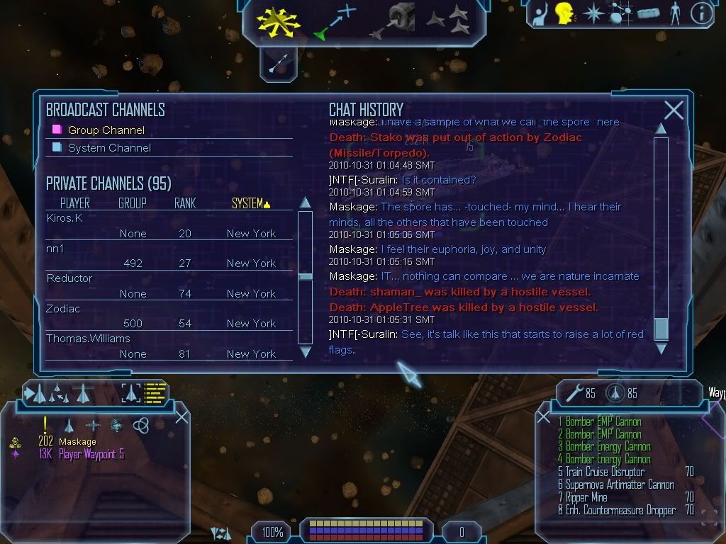 He also claimed to have killed around twenty-two bombers with 'is Kusari Explorer, and that he caused the BAF to shoot down their own snubcraft with his near-suicidal flight tactics. 'turns out he was actually a halfway decent fellow, after the death threats 'n all. Well, after the Gunboat left, me an' Greg headed up to Tau 23 to do some recon or some such. We encountered what may have been the strangest convoy I've ever seen. And I've seen plenty of strange convoys, I used't be a Zoner. I also grabbed some of the transmission logs for use 'ere: