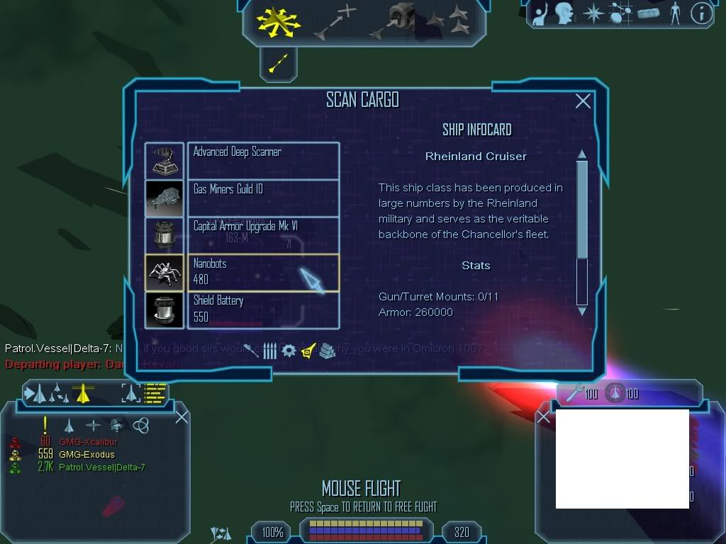 Kaaaaaaay, so! I have a story to tell ya all. Log on Black Squadron, second I do I see two GMG in Omicron 100, right? So I'm like fine, go in, tell em to get out. Only to find something interesting. They're flying a Battlestar and a Rheinland Cruiser with GMG IDs...