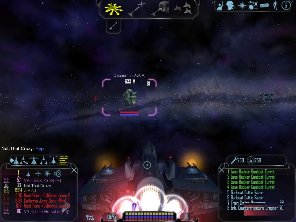 Managed to scrounge up 250.000 creds that will go directly to my 'Diamonds for Lina' foundation, but in the meantime, got shot at by a too willing Navy Gunboat with the transponder WolfCrest. After Mason got back and we talked with a local [427th] navy boy that was quite agreeable, the blood hounds that now were surrounding us (Mason's new pet, Solari, showed up) and we started shooting ships up. It was fun hour.