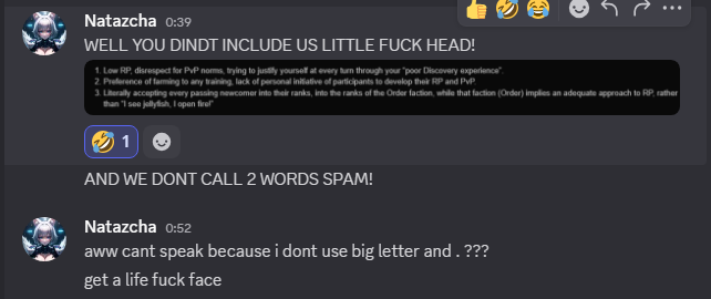 Literally accepting every passing newcomer into their ranks, into the ranks of the Order faction, while that faction (Order) implies an adequate approach to RP, rather than “I see jellyfish, I open fire!”