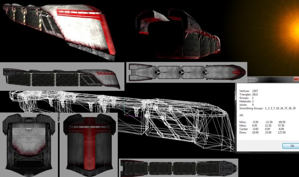 Also, your texture files are bland. Freelancer ships make heavy use of tiled textures, especially for large, continuous areas, like the top and bottom of your ship.